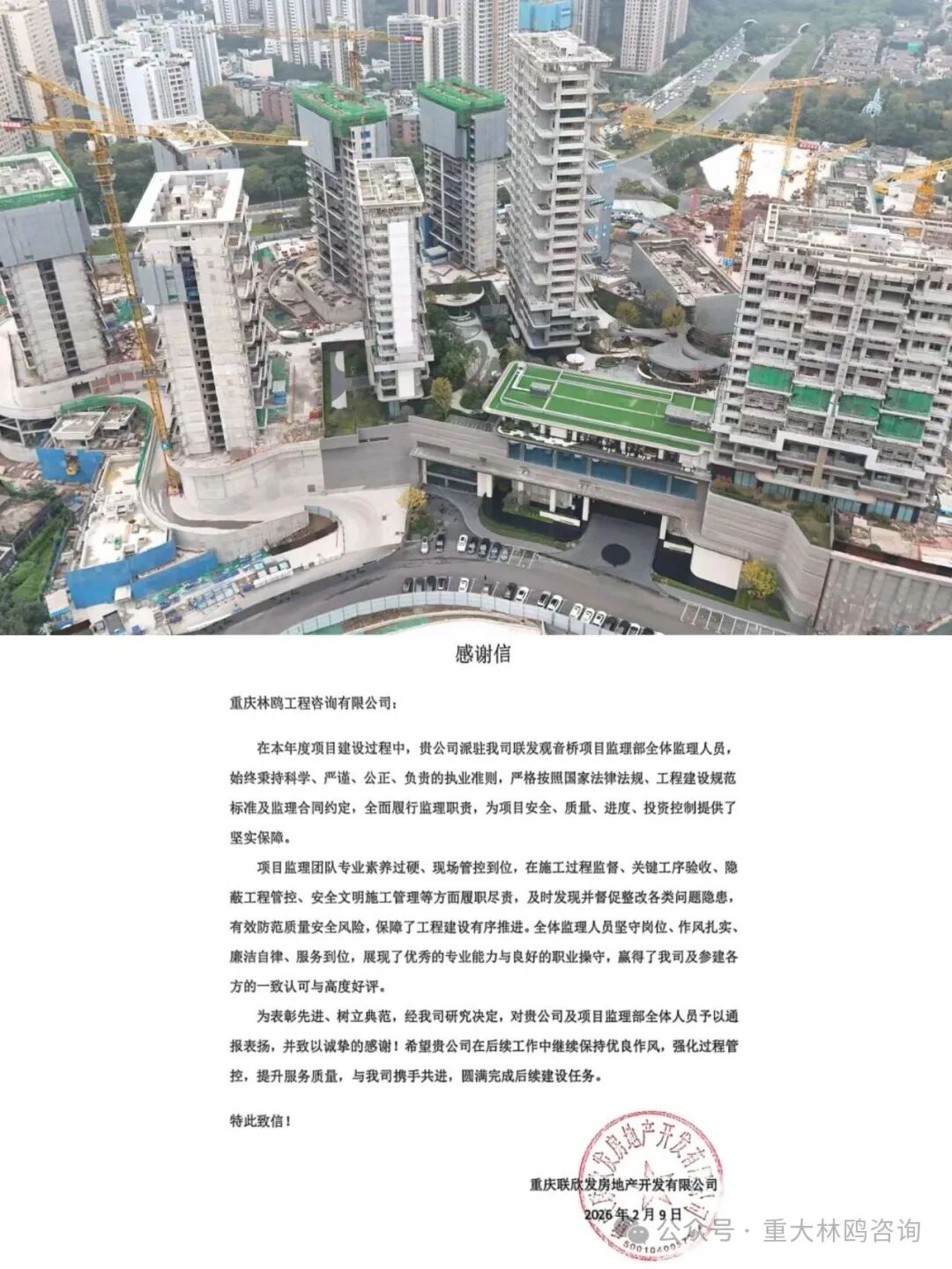 近日,我司收到重庆联欣发房地产开发有限公司发来的《感谢信》,对我司派驻观音桥项目监理部全体监理人员的专业表现与突出贡献予以通报表扬。这标志着林鸥咨询在工程咨询领域的专业能力与优质服务获得了客户的高度认可。